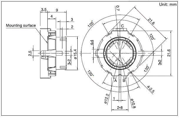 21.6x21.6x4 21型中空轴装置 适合多功效化的中空型,满足节省空间化的厚4mm薄型。