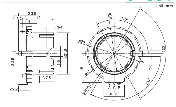 28x29x4 28型中空轴装置 实现了本体厚度4mm的薄型化和良好的操作感受。