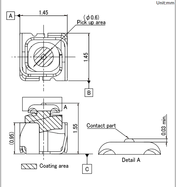1.4x1.4x1.55mm 压接接触器 绝缘涂层型最适用于连接要求稳定高频性能的设备