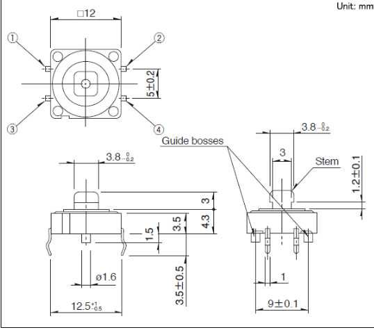 12x12x12mm 12mm方型(按入式)具有稳定操作感的连接式轴感和宁静面轴杆。