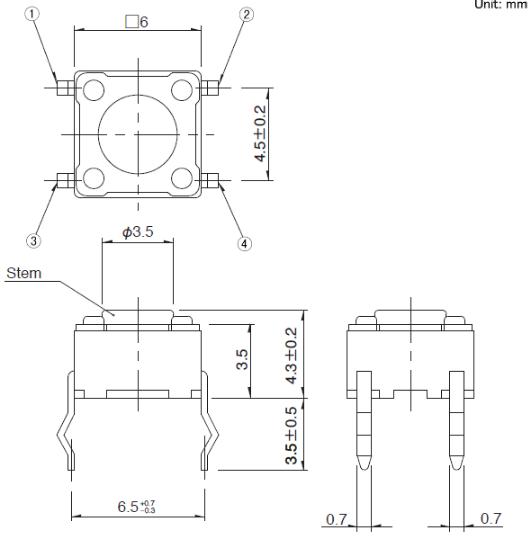 6x6x4.3mm 6mm方型(按入式) 易使用且有富厚的产品种类而受到好评的6mm方型。