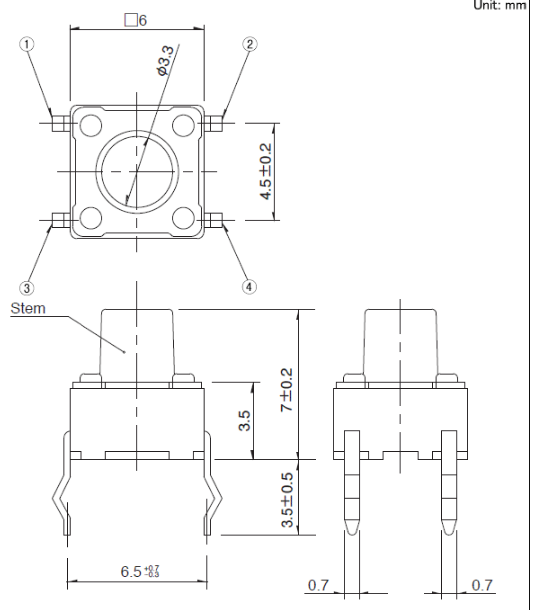 6x6x7mm 6mm方型(按入式) 易使用且有富厚的产品种类而受到好评的6mm方型。