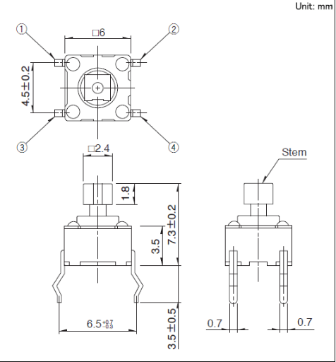 6x6x7.3mm 6mm方型(按入式) 易使用且有富厚的产品种类而受到好评的6mm方型。