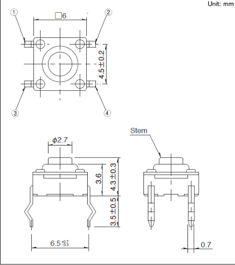 6x6x4.3mm 6mm方型防尘型(按入式)独吞的防尘结构和敏感的操作感, 适应于电子机械。