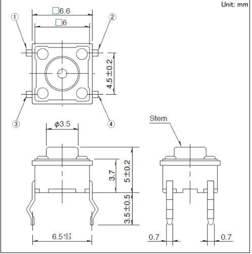 6.6x6.6x5mm 6.6mm方型(按入式) 具有敏感的操作触感, 通用性杰出的简易防尘型。