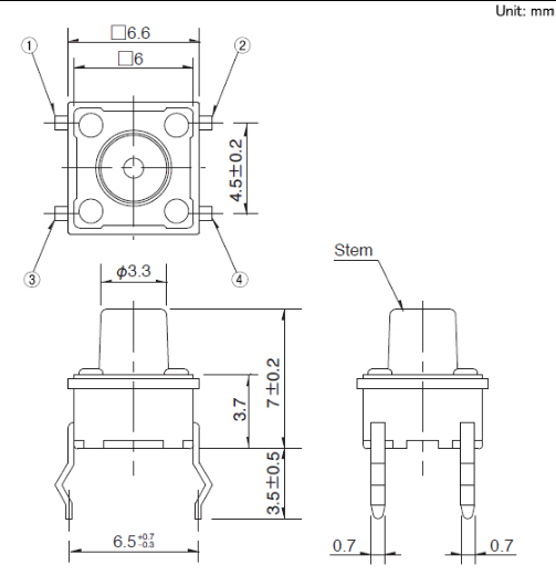 6.6x6.6x7mm 6.6mm方型(按入式) 具有敏感的操作触感, 通用性杰出的简易防尘型。