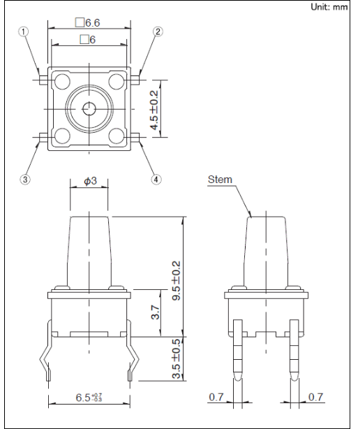 6.6x6.6x9.5mm 6.6mm方型(按入式) 具有敏感的操作触感, 通用性杰出的简易防尘型。