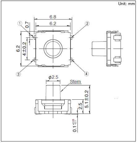 6.2x6.2x5.1mm 6.2mm方型中行程型(外貌贴装) 由于接纳了橡胶按钮, 实现了0.3?0.55mm的超行程?