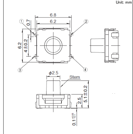 6.2x6.2x5.1mm 6.2mm方型中行程型(外貌贴装) 由于接纳了橡胶按钮, 实现了0.3?0.55mm的超行程?