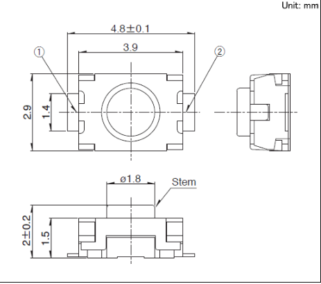3.9x2.9x2mm 3.9×2.9mm小型(外貌贴装) 为组合部件的小型, 薄型化做出孝敬的, 按钮高度1.5mm & 2mm型?