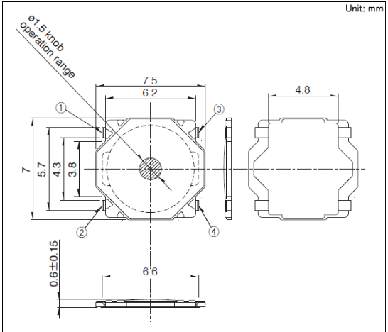 7.5x7x0.6mm 7.5×7.0mm薄型长寿命(外貌贴装)薄型0.6mm·长寿命500万次。