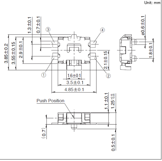 3.5x3.55x1.25mm 3.5×3.55mm薄型Side Push型(外貌贴装) 实现较高的焊接强度和小型化、薄型化(1.25mm)。