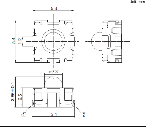 5.3x5.4x3.85mm 5.3×5.4mm中行程型(外貌贴装) 兼顾了较重作入手感与静音的小型化中行程类型。