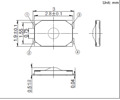 2.8x1.9x0.55mm 2.8×1.9mm小型、附带凸起的型(外貌贴装) 为提高组合部件的薄型化、贴装效率做出了孝敬的本体宽度1.9mm型。