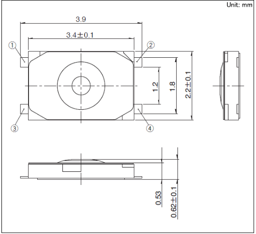 3.4x2.2x0.62 3.4×2.2mm小型,附带凸起的型双重行动型(外貌贴装) 宽2.2mm的小型双重行动型。