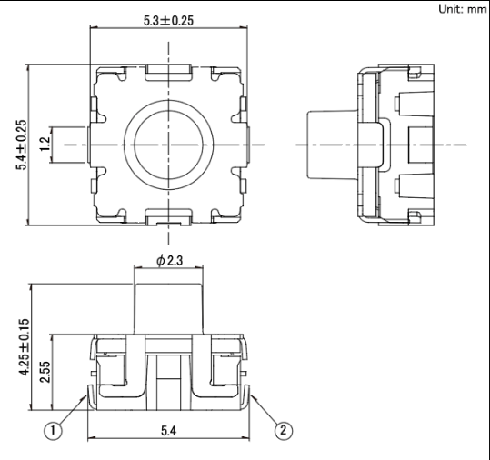 5.3x5.4x4.25mm 5.3×5.4mm中等行程的型(外貌贴装) 实现了可靠的操作触感的小型中行程类型。