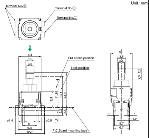 9.4x9x6.9mm 1.5mm行程立式 实现无铅焊接外貌贴装的按动开关。
