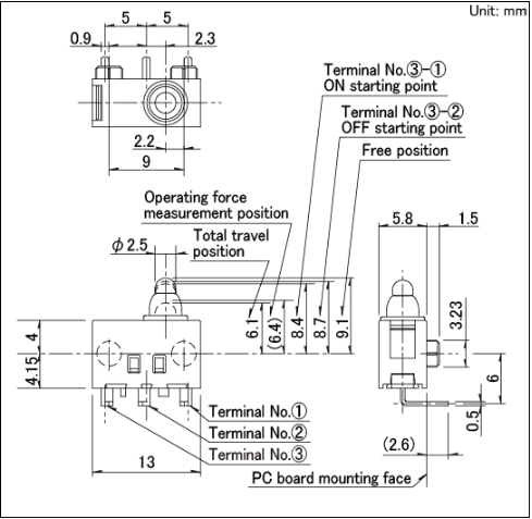 13x5.8x8.35mm 防水型 无驱动机构,可斜压的长行程型。