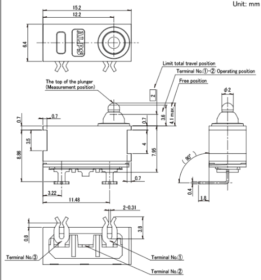 15.2x6.4x7.95mm 防水型 运用叉型端子可实现免焊锡连接。