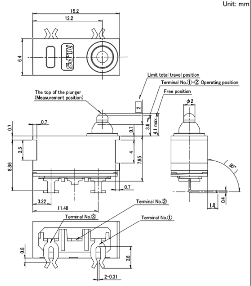 15.2x6.4x7.95mm 防水型 运用叉型端子可实现免焊锡连接。