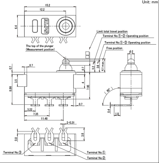 15.2x6.4x7.95mm 防水型 运用叉型端子可实现免焊锡连接。
