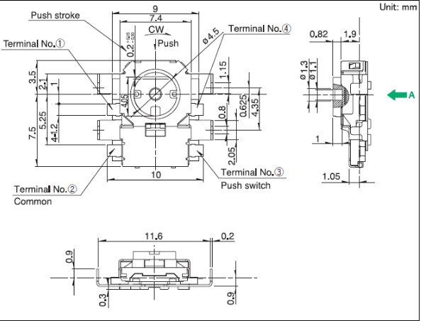 编码器和按钮操作型开关 可以利用装备侧面空间的小型多功效装置。