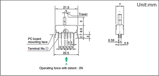 最大额定/最小额定(电阻负载) 0.1A 30V DC/50μA 3V DC,接触电阻(初期/寿命后) 25mΩ max./65mΩ max.,无负载寿命 10,000 cycles 45mΩ max.负载寿命(最大额定负载) 10,000 cycles 65mΩ max.操作部长度: 6mm,电路数