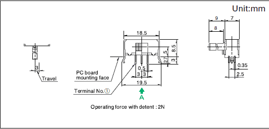 最大额定/最小额定(电阻负载) 0.1A 30V DC/50μA 3V DC,接触电阻(初期/寿命后) 25mΩ max./65mΩ max.,无负载寿命 10,000 cycles 45mΩ max.负载寿命(最大额定负载) 10,000 cycles 65mΩ max.操作部长度: 9mm,电路数